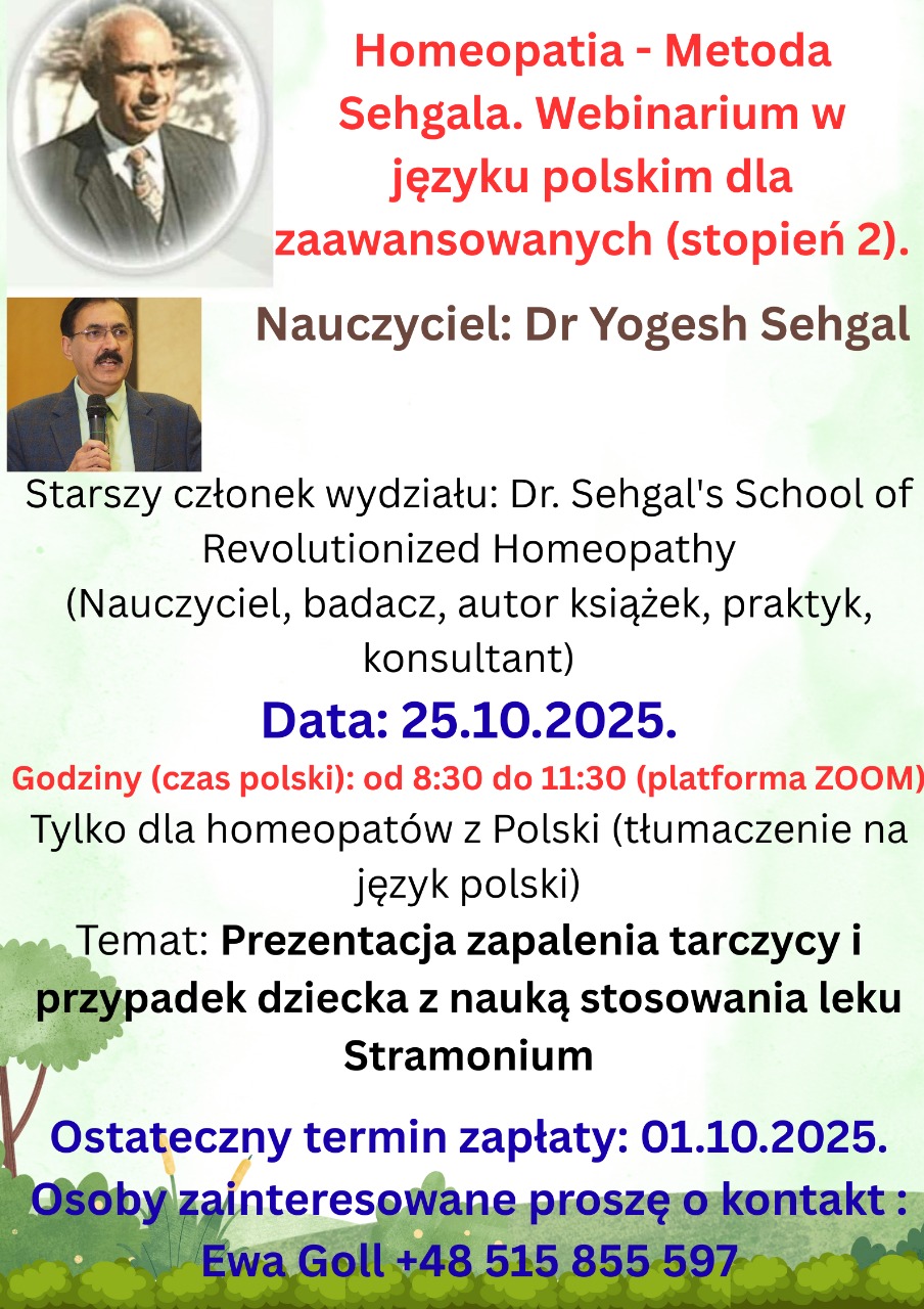 Sehgal method Webinar Teacher: Dr.Yogesh Sehgal (With German translation) Last Date of Registration 10th Nov. 2025 Contact: Marion Schulte Phone: +49 15785927188